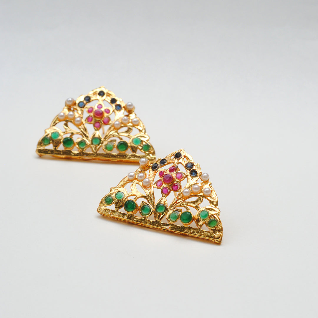 Inspired by the cherished jewels of generations past, our gulzar necklace is a tribute to timeless elegance. Crafted with Nauratan work in 21K gold plating, adorned with pearls and glass stones, this piece exudes sophistication and grace. Each element is carefully chosen to reflect the opulence of traditional craftsmanship, reminiscent of the treasures passed down from my grandmother.