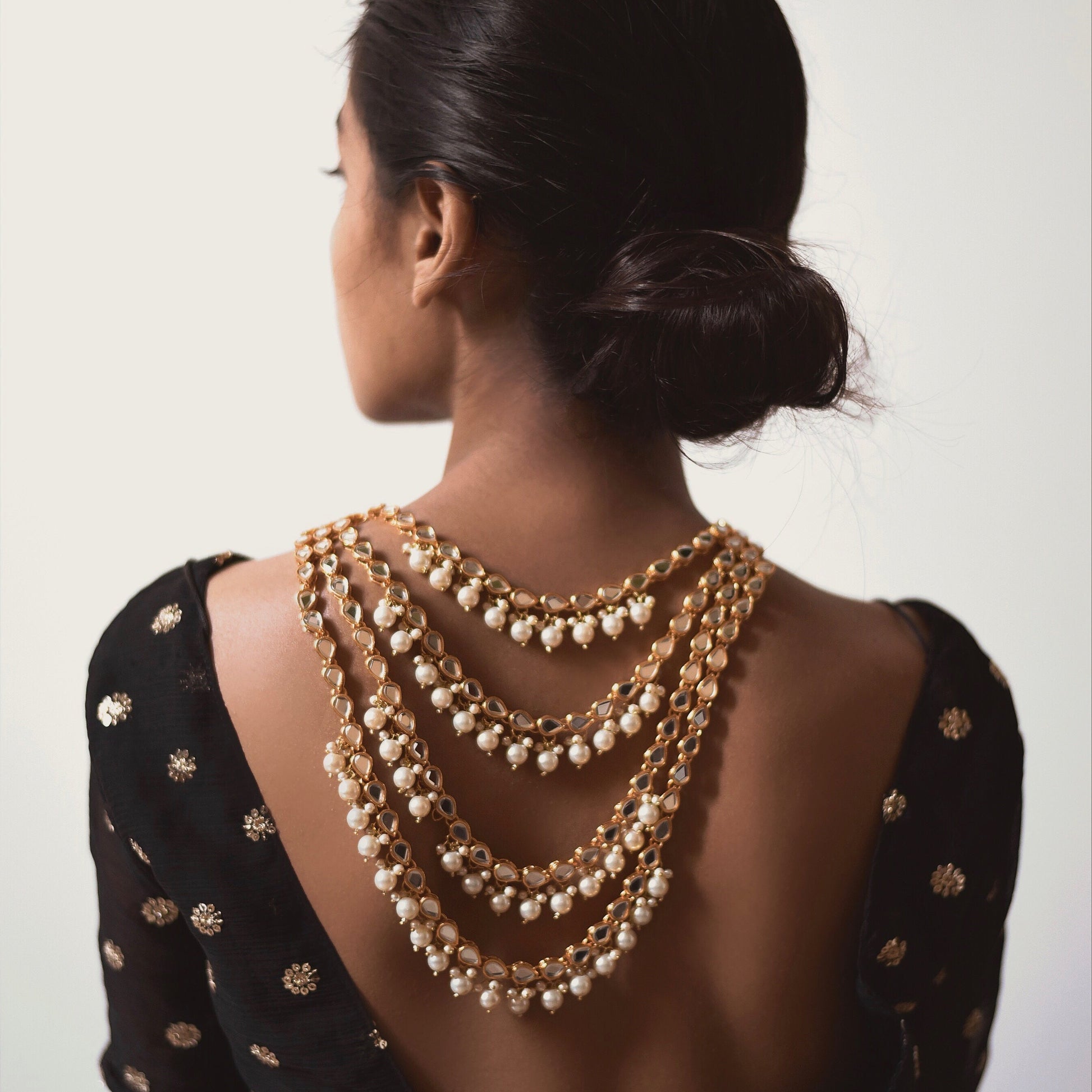 Elevate your style with our exquisite three-layered teardrop necklace, adorned with pearl hangings. Each teardrop-shaped motif exudes elegance and sophistication, making this necklace a timeless addition to your jewelry collection.