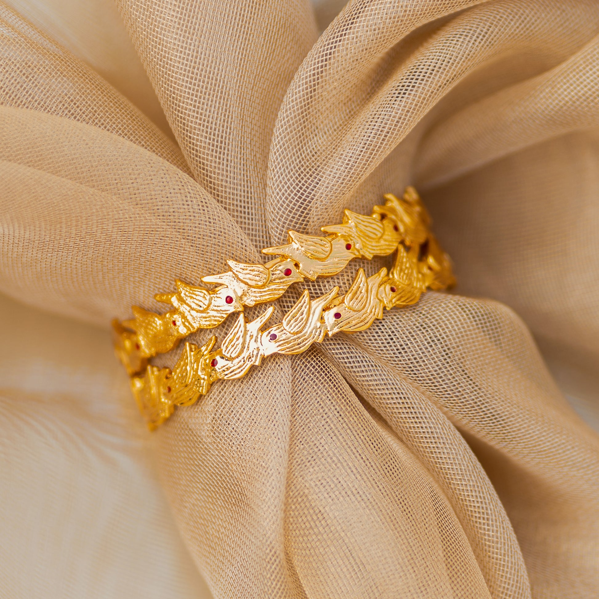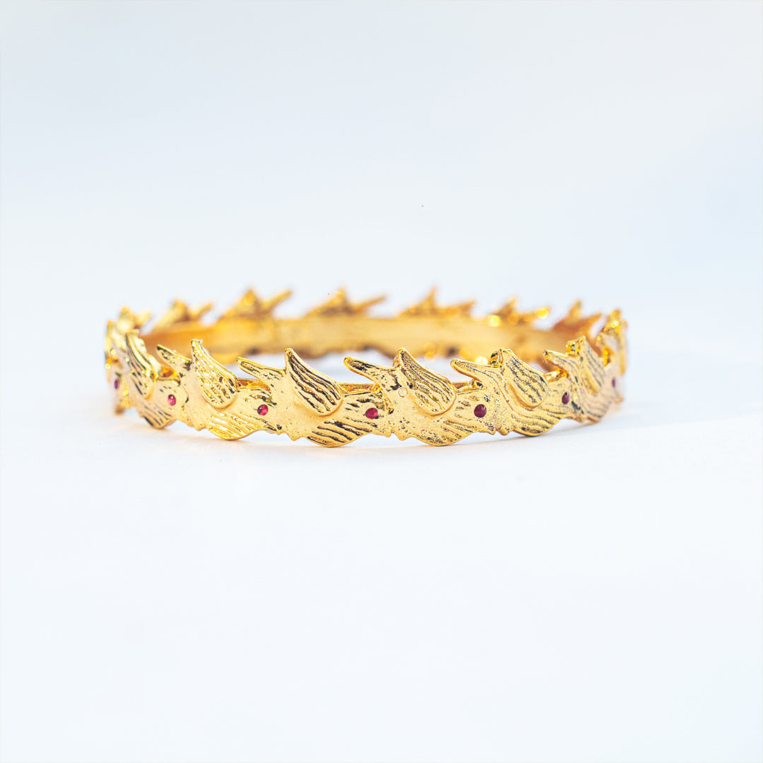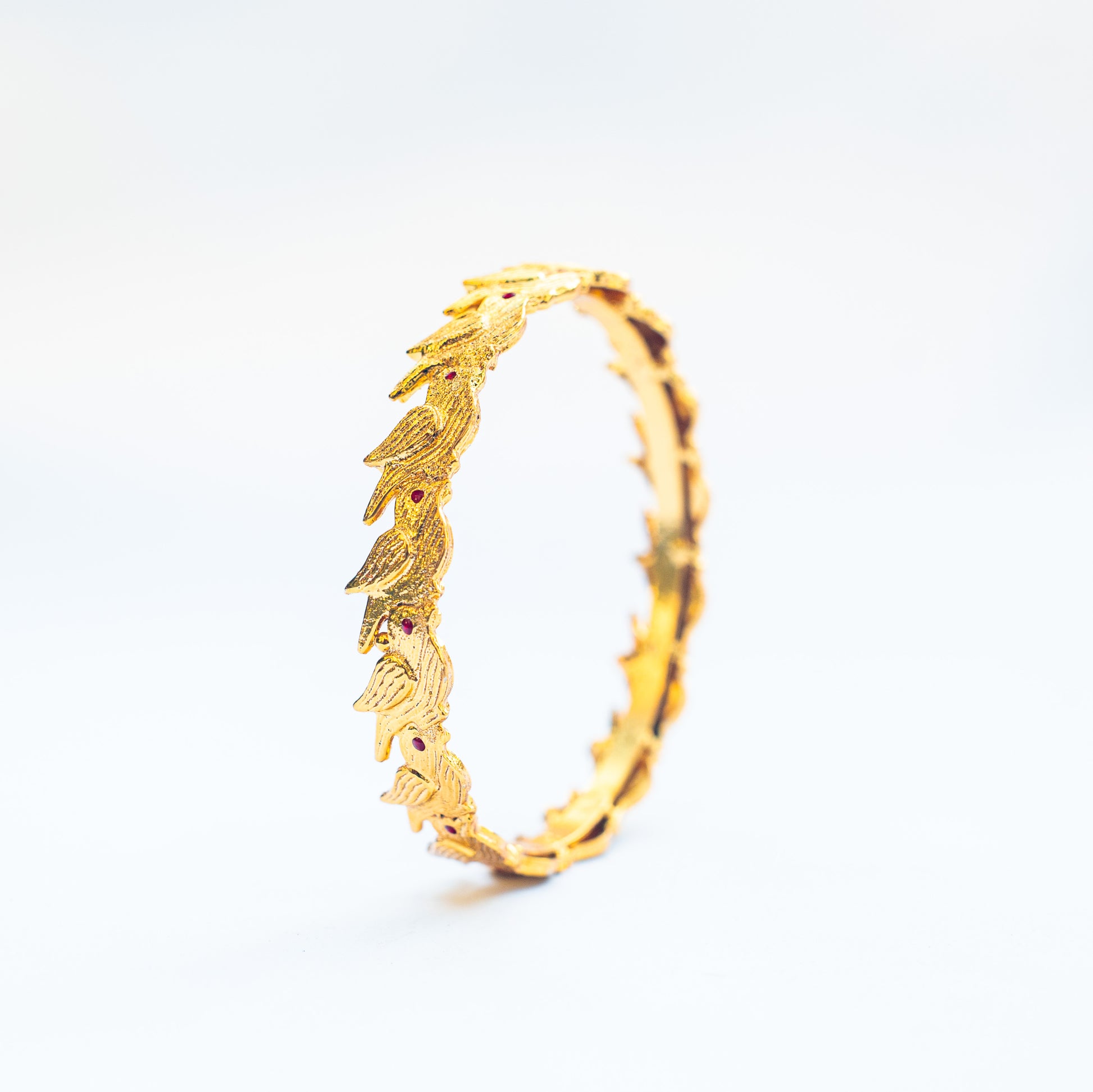 Presenting our exquisite fusion bangle: a seamless integration of Koel birds gracefully fused together in a captivating design. Each Koel bird is meticulously handcrafted, capturing the intricate details of these majestic creatures. Set against a backdrop of gleaming metal, this bangle celebrates the beauty of nature with a touch of elegance. Adorn your wrist with this unique masterpiece, and let the harmonious blend of Koels inspire admiration and awe wherever you go.
