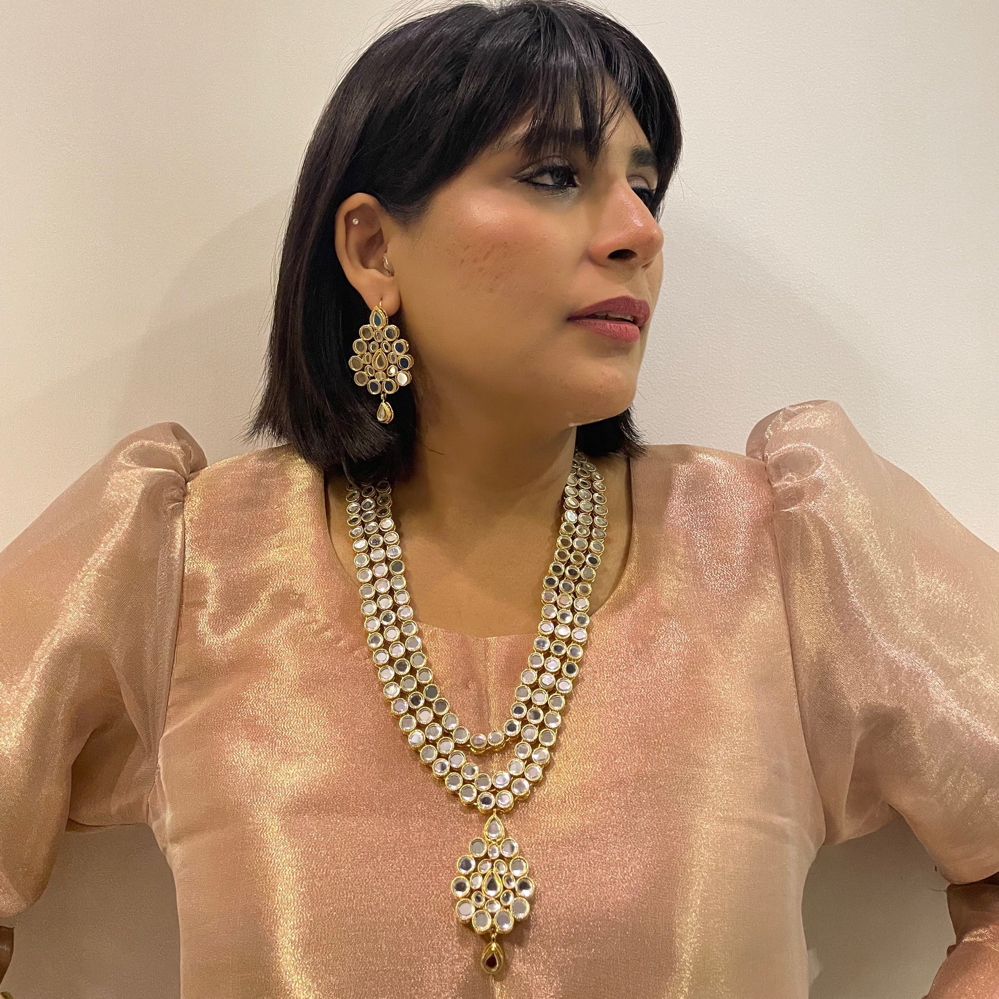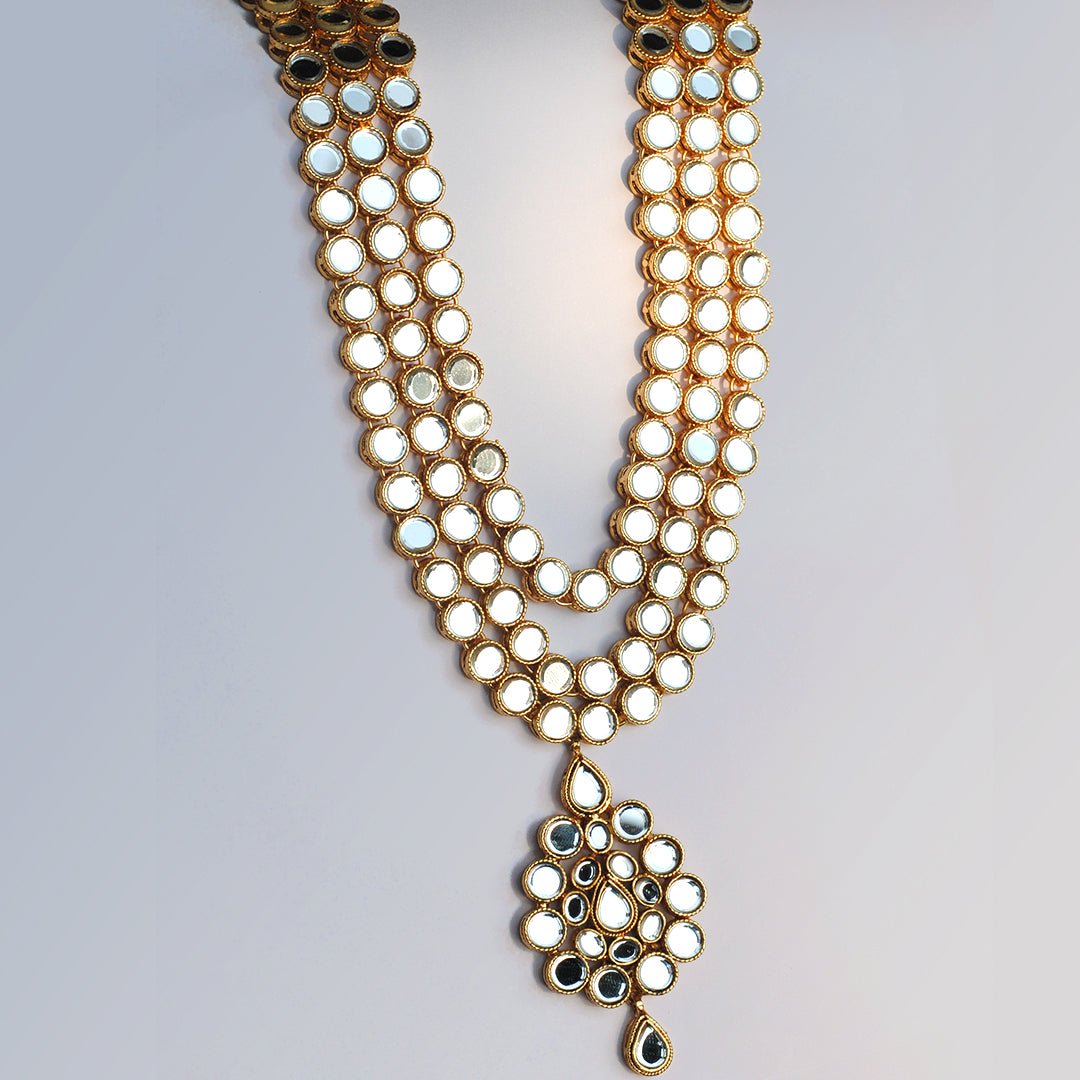 Introducing our versatile Collar Style Necklace, featuring a 21K gold plated base adorned with round kundan stones. This elegant piece can be worn as both a collar necklace and a maala, offering timeless sophistication and effortless style for any occasion.