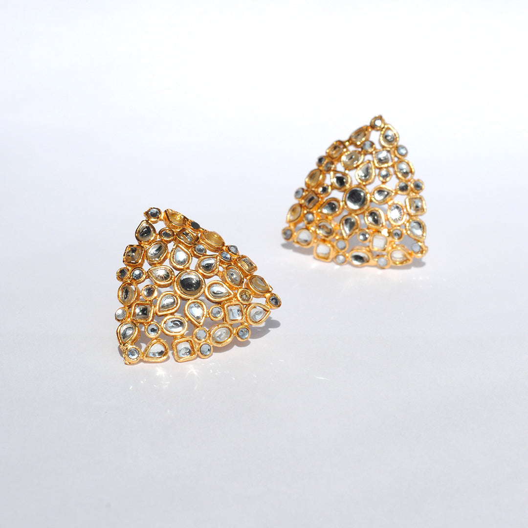 Our Trikona earrings derive their name from the Sanskrit word for triangle, symbolizing the beauty of three corners. Inspired by Mughal architecture and adorned with sheesha work, these earrings capture the intricate detailing and grandeur of the era.